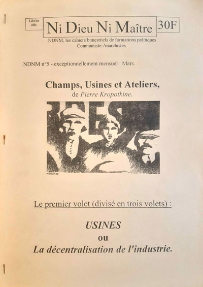 - nº 5 (1998, mars), exceptionnellement mensuel, 14 p. — « Usines, ou la Décentralisation de l’industrie » (1er volet de Champs, usines et ateliers de Pierre Kropotkine)